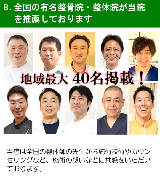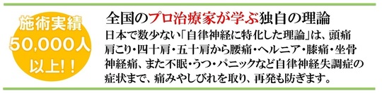 そのいずれも痛い場所ばかりを追って、全身のバランスに不可欠な「自律神経」に着目せずに体の歪みだけを原因にしているのが現状です。体の歪みのほとんどは「筋肉」「内臓」「循環」などをコントロールする、「自律神経の乱れ」からくるという事実を基に生み出された、独自の理論が当店の施術です。これを受ける事ができるところは全国でも数少ないのです。