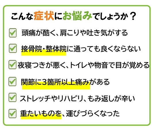 早く体の痛みをとりたい方、体調を整えたい方にお勧めです。
